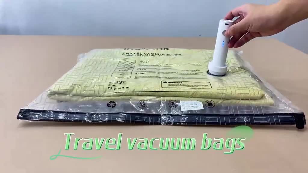 Inspink Cordless Travel Vacuum Compression Bags with Rechargeable Electric Pump. These bags save up to 80% space in your suitcase. The 25W Wireless USB Pump with a 1500mAh battery ensures effortless compression. Durable, waterproof, and reusable, these bags are perfect for business trips, vacations, or backpacking.